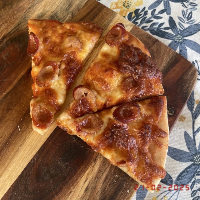 今天的晚餐:发面饼,Homemade pizza,黄瓜炒蛋,和蒜蓉丝瓜。#吃 #丝瓜